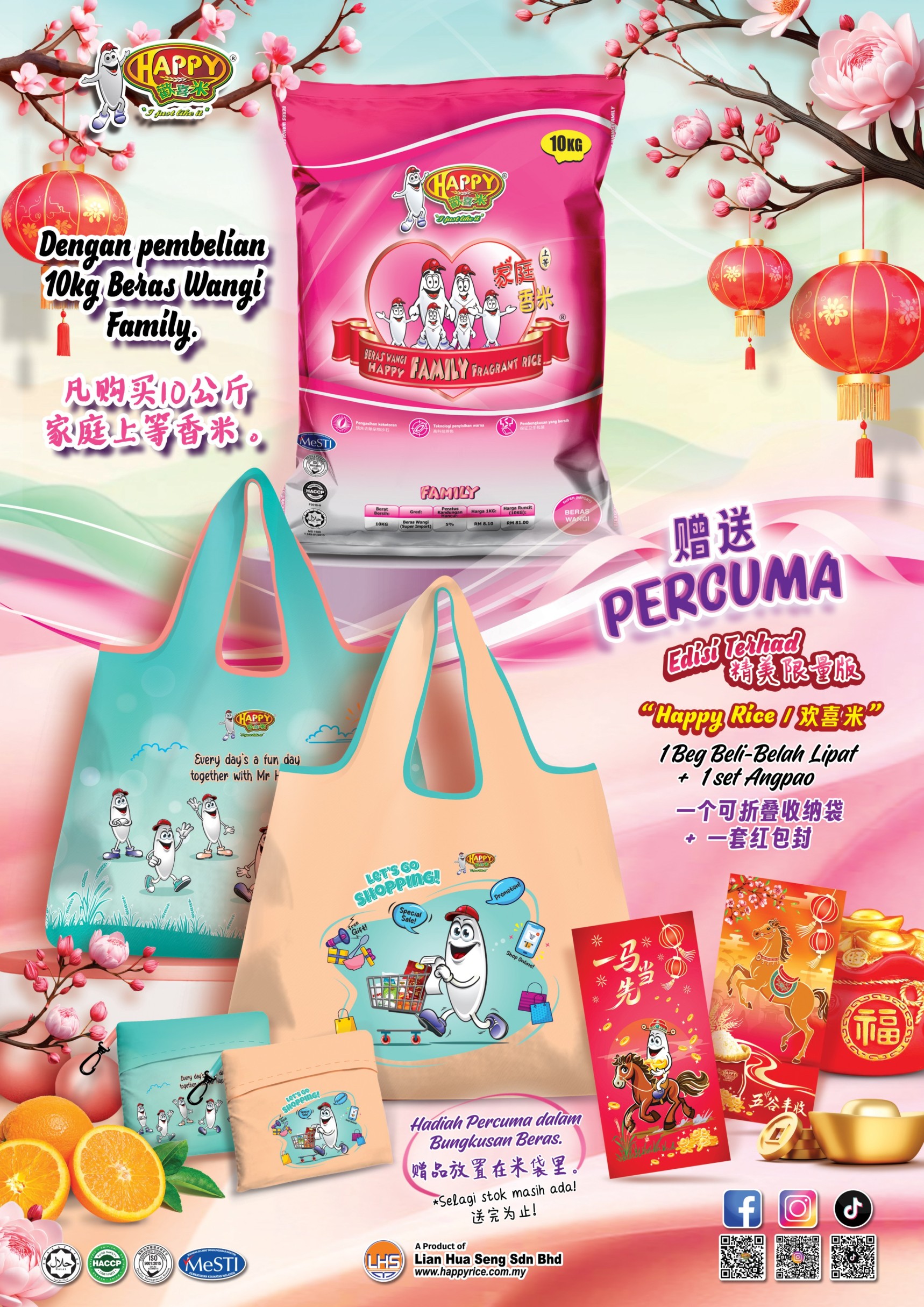 anda akan menerima 1 Beg Beli-Belah Lipat dan 1 Set Angpao ‘Happy’